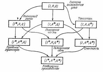 Рис. 1.1. На рис. 1.1 приведена классификационная структура, использующая значение трех классификационных параметров: I, R, Q. Звездочка означает, что. в данной системе управления для разных подсистем нет совпадения по множеству значений этого параметра. Около каждой позиции классификационной структуры указан пример системы управления, для которой выполнены соответствующие условия. Пояснения нужны только для двух случаев, так как остальные примеры мы уже проанализировали. Для случая (I*, R*, Q) можно рассматривать систему управления движением городского транспорта. В такой системе происходит естественная декомпозиция системы управления на подсистемы по видам транспорта (троллейбусно-трамвайное управление, управление метрополитеном и т. п.). В распоряжении каждой такой подсистемы имеются свои средства достижения однотипной цели — максимизации количества перевозимых пассажиров при обязательной экономии энергии и ресурсов. Для случая же (I*, R*, Q*) примером может служить система управления ходом спектакля в театре. Ведущие спектакль согласуют между собой различные подсистемы (систему освещения сцены, систему музыкального сопровождения, систему смены декораций и т. п.). Все подсистемы имеют свои средства и свои цели, согласованные с помощью режиcсерского плана с глобальной целью максимизации эстетического наслаждения, которое испытывают зрители. Приведенные нами иллюстративные примеры в ряде случаев упрощены, но нам хотелось, чтобы они были несложны и ненадуманы. И если читатели почувствовали смысл классификации, приведенной на рис. 1.1, то авторы достигли своей цели полностью. § 1.5. Зачем нужна децентрализация?Возникает вполне законный вопрос: не является ли децентрализация в системе управления следствием нашего плохого знания поведения объекта управления или того, как надо строить системы управления? Мы хотим привести ряд соображений в пользу того, что во многих случаях децентрализованное управление есть не ухудшенный вариант централизованного или иерархического, но вполне законный, а часто и единственно возможный вид управления. Кое-какие мысли по этому поводу мы уже высказывали выше. Здесь же мы суммируем их окончательно. 1. Не все технические, а особенно экономические и организационные системы, возникли на основании единого проектировочного замысла. Многие системы в их современном виде «никто не изобретал, не проектировал и не создавал». Они возникли из более простых систем в результате своеобразной технической эволюции, о которой мы будем говорить в заключительной части книги. Выражение, которое мы взяли в кавычки, является метафорическим. Конечно, в создании этих систем принимали участие и изобретатели, и проектировщики, и ученые. Но мы хотим подчеркнуть, что ни один из них не создал всю систему «целиком». Были люди, которые проектировали автоматические телефонные станции или локальные сети связи, но нет единого создателя Мировой телефонной сети или Мировой транспортной сети или Всемирного сообщества филателистов. В системах такого типа централизованное управление возможно лишь на уровне соглашений о путях развития системы, договоров о стандартах и основных ограничениях на пользование системой и т. п. Оперативное же управление самим процессом в них возможно, по-видимому, лишь децентрализованным образом. 2. Сл