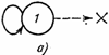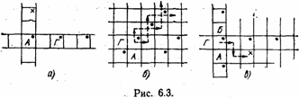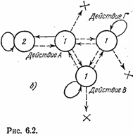 простую модель, иллюстрирующую возможности синтезогенеза. На рис. 6.1 В отличие от классического автомата с линейной тактикой наш автомат не может накапливать наказания безгранично и «умирает», когда число подряд действующих штрафов (пунктирные стрелки) превышает число состояний, имеющееся у автомата (для автомата, показанного на рис. 6.2, б, оно равно четырем). Кроме того, смена лепестков происходит равновероятно. Сигналы наказания и поощрения формируются средой следующим образом. Если автомат в данной клетке съедает пищу, то он получает сигнал поощрения, в противном случае—сигнал наказания. После того как автомат съест пищу (на что в модели требуется один такт) и уйдет из клетки, то пища может в ней одномоментно восстановиться или клетка останется пустой до того момента, когда по закону, характеризующему среду, пища снова восстановится. Если в одну и ту же клетку попадает несколько автоматов, то они принудительно объединяются и образуют новый более сложный «организм». Рассмотрим несколько ситуаций в эволюционном процессе на торе. На рис. 6.3 На рис. 6.2, б показана еще одна очень простая ситуация. Автоматы А и Г встречаются в клетке с пищей, объединяются и начинают движение. Каким оно будет? Это зависит от того, какое именно состояние окажется начальным. Ели это состояние, соответствующее состоянию 1 автомата А, то объединенный автомат сначала сделает шаг наверх. В этой клетке пищи нет и автомат получит наказание. Это заставит перейти его в состояние 1 бывшего автомата Г и сделать шаг на одну клетку вправо. Там пища есть. Съев ее, автомат сделает еще один шаг вправо. Получив наказание, он, как автомат А, сделает шаг вверх и получит пищу. Далее процесс будет повторяться циклически, если пища размещается на поверхности тора регулярным образом. Автомат будет двигаться по «диагональной линии» и жить вечное Если бы начальным состоянием объединенного автомата было состояние 1 автомата Г, то движение было бы аналогичным. Пунктирные стрелки показывают оба возможных пути автомата АГ. Усложнение структуры далеко не всегда приводит к улучшению функционирования. Это положение иллюстрируется рис. 6.3, в. В клетке с пищей образуется автомат АБГ. Пусть начальным его состоянием является состояние 1 автомата Г. Сдвинувшись на одну клетку вправо и получив сигнал штраф, автомат переходит (путем равновероятного выбора) в состояние автомата Б. Он сдвигается вниз, но пищи там нет. Опять следует равновероятный переход, и автомат снова попадает в состояние автомата Г. Происходит сдвиг вправо. Но так как пищи в этой клетке нет, объединенный автомат погибает, исчерпав все свои ресурсы. Если бы объединения не произошло, то при том распределении пищи, которое показано на рис. 6.3, в, все три простейших автомата могли бы жить вечно. Наши забавные автоматы на тороидальной поверхности можно исследовать с разных точек зрения. Но, к сожалению, это увело бы нас весьма далеко от основной канвы книги. Те, кому понравился этот мир, могут придумать много занимательных и интересных историй, полных драматизма и неожиданных метаморфоз, которые могут развернуться на поверхности тора. Для нас же важно отметить, что синтезогенез может приносить как пользу, так и вред, ибо иногда лучшее — враг хорошего. Тем не менее путь синтеза, своеобразной полимеризации, часто встречается в эво