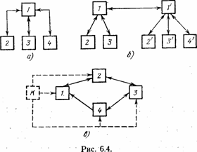 Интересно отметить, что децентрализованная структура, показанная на рис. 6.4,в, демонстрирует возможность введения в структуру «организма» неспецифического централизованного управления. Показанный на этом рисунке пунктиром блок синхронизации К. может по специальной кольцевой шине передавать сигнал одновременно всем ЭВМ, образующим систему. Это может быть, например, сигнал прерывания всех вычислений для приема новой внешней информации, или для повторения вычислений, или для тестовой проверки. Но такой центральный управляющий блок может и отсутствовать. Тогда синхронизация работы децентрализованной системы будет осуществляться по типу кольца стрелков, о чем было рассказано в гл. 5. Кроме этого основного пути эволюции ЭВМ приблизительно в те же годы развивался и еще один путь — создание ЭВМ на основе однородных клеточных структур, о которых мы также говорили в гл. 5. Этот путь был связан с идеей синтезогенеза в чистом виде. Предполагалось, что однородность и универсальность отдельных подсистем (автоматов, находящихся в клетках однородной структуры с потенциально однотипными связями между ними) позволят улучшить характеристики ЭВМ. Однако этого не произошло. Ибо сегрегациогенез оказался куда более эффективным в отношении этих характеристик. И следующий шаг в эволюции ЭВМ — комплексирование не однотипных, а узкоспециализированных подсистем, причем для каждой из них четко определены те функции, которые она реализует. Сначала это привело к структурам того же типа, что и показанные на рис. 6.4. Отличие состояло лишь в том, что ЭВМ, входящие в систему, стали специализированными. Например, они могли быть специально созданы для обработки символьной информации, работы с матрицами, предварительной обработки и преобразования сигналов, поступающих от объекта управления, и т. п. Но при этом, как в автоматных моделях с рефлексией или уровнями пессимизма — оптимизма, все такие ЭВМ могли действовать и вне системы, автономно. При дальнейшем сегрегациогенезе это свойство исчезло. Дифференциация