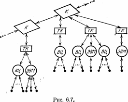 обслуживает десятки и сотни пользователей. На рис. 6.7 Сеть ARPA развивалась очень быстро. В короткий срок она охватила всю территорию США, а вскоре через английский и норвежский узлы связи дотянулась до Европы. В последующее десятилетие стали появляться и другие сети. В США стала функционировать сеть TYMNET, которая предоставляет своим пользователям услуги не только для обработки данных, но и позволяет им черпать информацию из банков данных, где хранится огромный объем информации по самым различным отраслям знаний. Создатели этой сети предполагают, что со временем она сможет оказывать такие же услуги, как и библиотеки. Требование читателя будет поступать в сеть, и читателю на экран дисплея будет высвечиваться текст книги. При желании пользователь может заказать этот текст для хранения дома. Тогда он будет выдан ему через печатающее устройство. Вообще, появление сети обработки данных породило и продолжает порождать новые функциональные возможности использования ЭВМ. Так, одно время в сети ARPA «печаталась газета» по проблемам искусственного интеллекта и робототехники. Корреспонденты вводили тексты статей в память своих ЭВМ. Далее эти статьи собирались на одной из ЭВМ, которая формировала «газету». Каждый читатель мог вызвать себе «газету» на экран дисплея, прочитать ее и при желании отпечатать всю целиком или некоторые особенно интересные для него статьи. Другое неожиданное применение сеть получила, когда в США происходила одна из конференций по проблемам искусственного интеллекта. В ней участвовали ученые не только США, но и ряда европейских стран. Необычным было то, что европейские участники при этом находились у себя дома и никуда не выезжали. Да и американские специалисты не покидали своего места жительства. Все доклады, присланные на конференцию, были введены в сеть, каждый участник мог ознакомиться с наиболее интересными для себя сообщениями и выступить в дискуссии или задать докладчику вопросы. Выступления и вопросы просто вводились с терминальных устройств в сеть. Докладчики получали их и вводили в сеть свои ответы на вопросы. Самое приятное заключалось в том, что любой участник конференции мог отдыхать в любое время, не рискуя что-либо упустить. Более того, из-за различий во времени между США и Европой часть участников конференции активно работала, а другая спокойно спала, чтобы утром включиться в работу с новыми силами. Но мы несколько отвлеклись от основной канвы. Вернемся к анализу процесса эволюции сети обработки данных. Кроме нескольких сетей в США появились общегосударственные территориальные сети в ряде европейских стран. В 1974 г. вступила в строй первая очередь сети CYCLADES во Франции. В 1971 г. был подписан протокол между восемью странами Европы о создании европейской сети обработки данных. В 1976 г. эта сеть начала функционировать в составе пяти узлов коммутации (Лондон, Цюрих, Париж, Милан, Испра). Через Лондон эта сеть соединилась с американскими сетями, возникли узлы в Вене и многих других городах. Некоторые страны Восточной Европы также установили каналы связи с европейской сетью. А сейчас имеется канал, соединивший Москву с несколькими сетями обработки данных в Европе. Ведутся активные работы по созданию территориальной сети СССР. Так происходит эволюция этой новой технической системы, которая сулит чело