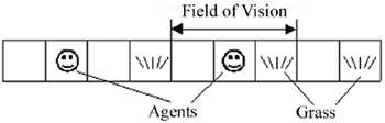Fig. 1. Agents in the one-dimensional cellular environment. The time is discrete. At any iteration, each agent executes exactly one action. The set of possible actions of agents is the following: 1) resting; 2) moving to a neighboring cell (to the left or to the right); 3) jumping (over several cells into random direction); 4) eating; 5) mating. The grass patches appear randomly and grow certain time at some cells of the environment. The agents are short-sighted. This means that any agent views the situation only in three cells: in its own cell and in two neighboring cells. We designate these 3 cells as field of vision of an agent (Fig.1). We introduce two quantitative parameters, corresponding to the agents needs: 1) Motivation to search the food ME, which corresponds to the need of energy; 2) Motivation to mating MR, which corresponds to the need of reproduction. Motivations are defined as follows (Fig.2):
