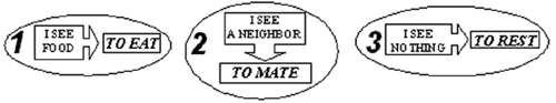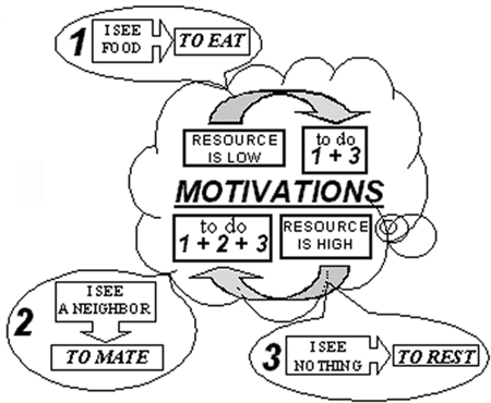 Fig. 5.Scheme of behavioral control of agents with motivations. If the energy resource of an agent is low, the motivation to search food is large, and the motivation to mating is small, so the agent uses only two mentioned rules, the first and the third the mating is suppressed. If the energy resource of an agent is high, the motivation to mating is turned on, and so the agent seeks to mate the second and the third rules govern mainly the agent behavior, however, sometimes the first rule works too. So, the transition from the scheme of control without motivations (Fig. 4) to the scheme with motivations (Fig. 5) can be considered as the emergence of a new level of hierarchy in the control system of an agent. This transition is analogous to the metasystem transition from simple reflexes to complex reflex in the Metasystem Transition Theory by V. Turchin [7]. 4 Conclusion Thus, the model of evolutionary emergence of purposeful adaptive behavior has been developed. The model demonstrates that simple hierarchical control system, where simple reflexes are controlled by motivations, can emerge in evolutionary processes, and this hierarchical system is more effective as compared to behavioral control governed by means of simple reflexes only. References 1. Yaeger, L.. Computational Genetics, Physiology, Learning, Vision, and Behavior or PolyWord: Life in a New Context // Langton, C. G. (ed). Artificial Life III. Addison-Wesley, (1994), pp. 263-298. 2. Ackley, D., Littman, M. Interactions between learning and evolution // Langton, C. G., Taylor, C., Farmer, J. D., and Rasmussen, S. (Eds.) Artificial Life II. Reading, MA: Addison-Wesley. (1992), pp. 487-509. 3. Nolfi S., Parisi D. Learning to adapt to changing environments in evolving neural networks // Adaptive Behavior V.5, N.1, (1997), pp. 75-98. 4. Tsitolovsky, L.E. A model of motivation with chaotic neuronal dynamics // Journ. of Biological Systems, V. 5. N.2, (1997), pp. 301-323. 5. Donnart, J.Y. and Meyer, J.A.. Learning Reactive and Planning Rules in a Motivationally Autonomous Animat // IEEE Transactions on Systems, Man, and Cybernetics - Part B: Cybernetics, V. 26, N.3, (1996), pp. 381-395. 6. Balkenius, C. The roots of motivations. // In J.-A. Mayer, H. L. Roitblat and S. W. Wilson (eds.), From Animals to Animats II, Cambridge, MA: MIT Press. (1993) http://www.lucs.lu.se/People/Christian.Balkenius/Abstracts/ROM.html 7. Turchin, V. F. The Phenomenon of Science. A Cybernetic Approach to Human Evolution. Columbia University Press, New York, (1977). See also: http://pespmc1.vub.ac.be/POSBOOK.html |