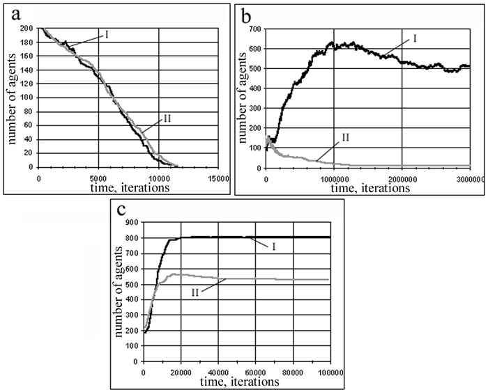 Fig. 3. Dependencies of number of agents in population with motivations (I) and without motivations (II) on time for different probabilities of grass appearance, Pg : a) Pg = 1/2000, b) Pg = 1/200, c) Pg = 1/20. 3.3 Analysis We performed detailed analysis of agents actions evolution for population with and without motivations. Basing on this analysis, we interpreted behavioral control of agents. The scheme of behavioral control of agents without motivations that was discovered by evolution is shown at Fig. 4. This scheme includes three rules, which are used by agents during their life. The first rule says that if an agent sees a grass patch, it seeks to eat this food. Namely, it eats food, if the food is in its own cell, or goes to grassy neighboring cell and eats food at the next moment of time. The second rule says that if an agent sees a neighbor, it makes mating action, trying to give birth to an offspring. These two rules are just instincts, which we forced to agents of an initial population. The evolution confirmed that they are useful and adaptive. The third rule says that if an agent doesnt see anything in its field of vision, it decides to rest. This rule was discovered by evolution, and, of course, the rule has a certain adaptive value. It is obvious that such agent behavior is determined by current state of the external environment only. These three rules can be considered as simple reflexes.